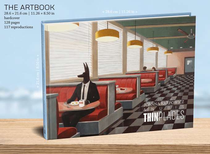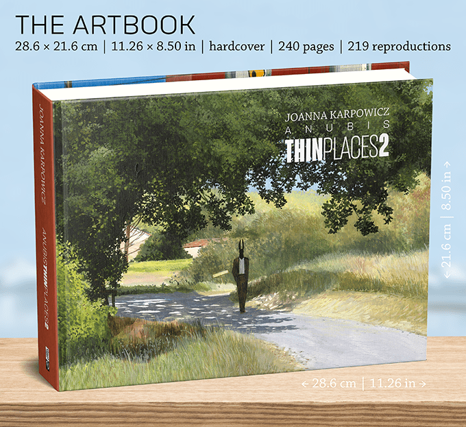 “Anubis. Thin Places” vol 2. is a collection of 219 high-quality reproductions of paintings created in the years 2021 – 2023 (to be exact, September 2023). For comparison: volume 1 contained 117 reproductions. The artbook has a hardcover, format: 28 x 21 cm (11.02” x 8.27” ), and has 240 pages total.